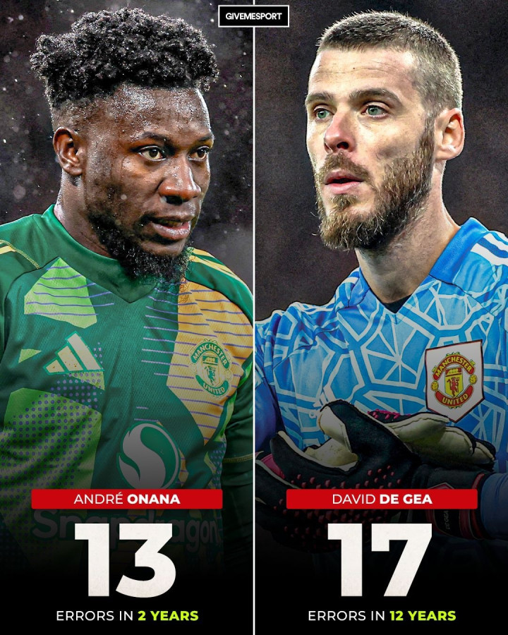 数据统计显示,奥纳纳在2年(1年半)内已经13次失误导致丢球,而德赫亚12年有17次失误导致丢球。